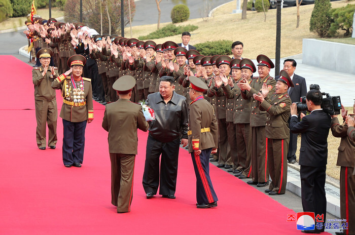 North Korean leader Kim Jong-un (C, in leather jacket) visits Kim Jong-il University of Military and Politics, nurturing future highest military leaders, in Pyongyang on April 10, 2024, in this photo released by the North's official Korean Central News Agency. (For Use Only in the Republic of Korea. No Redistribution) (Yonhap)
