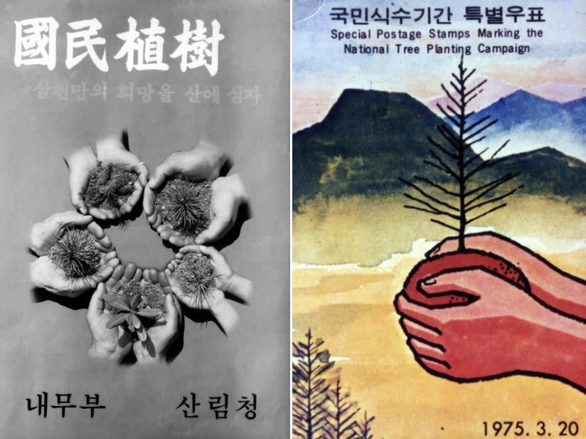 | ▲ '산림녹화 기록물' 자료 왼쪽부터 1970년대 홍보물, 1975년 국민식수기간 특별우표 [문화재청 제공. 재판매 및 DB 금지] |