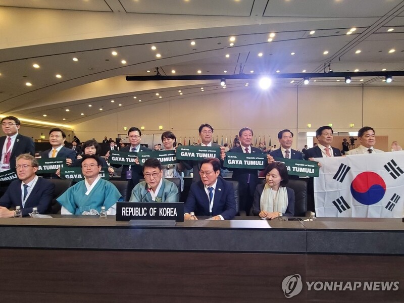 | ▲ 세계유산 등재 감사연설하는 최응천 문화재청장 (서울=연합뉴스) 17일 오후(현지시간) 사우디아라비아 리야드에서 열린 제45차 유네스코 세계유산위원회에서 ‘가야고분군(Gaya Tumuli)’이 유네스코 세계유산으로 등재된 후 최응천 문화재청장(가운데)이 위원국들을 대상으로 감사연설을 하고 있다.. 2023.9.17 [문화재청 제공. 재판매 및 DB금지] photo@yna.co.kr |