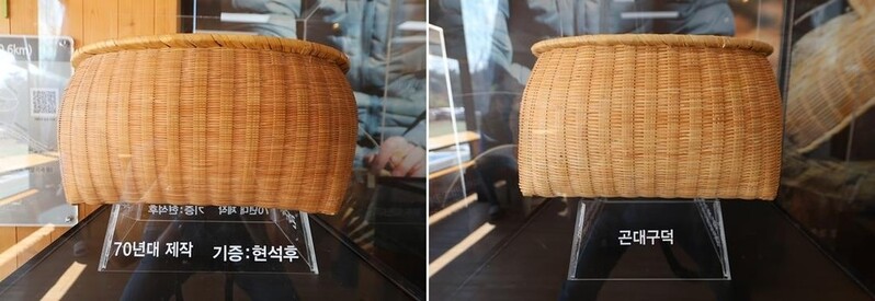 | ▲ (서귀포=연합뉴스) 변지철 기자 = 제주도 무형문화재 구덕장 보유자 고(故) 김희창(1941∼2021) 선생의 작품으로 가장 공이 많이 든다는 곤대구덕. 왼쪽은 1970년대 제작, 오른쪽은 도무형문화재 지정 후 제작한 것으로 제작시기에 수십년의 차이가 있지만 전혀 변형이 없다. 2023.9.17 |