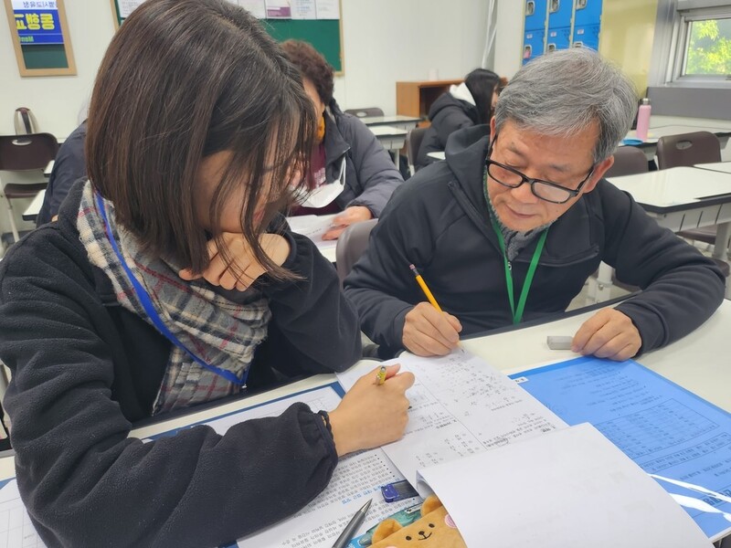 SEOUL, Nov. 22 (Yonhap) -- Yoon Sang-ki, 75, smiled when his mentor, a middle schooler around the age of his grandchildren, approved of the answer he had carefully written down on his math worksheet during a recent tutoring session offered at Jin Hyung Middle and High School in central Seoul.