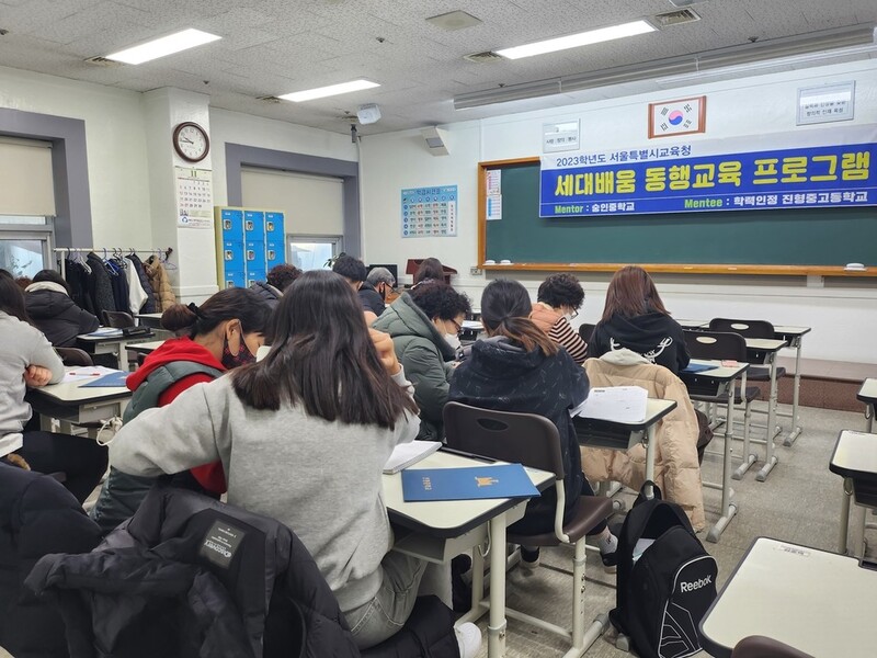 ▲ Senior students, along with their middle school mentors, study at a classroom in Jin Hyung Middle and High School in central Seoul, as part of a generational mentorship program led by the Seoul Metropolitan Office of Education on Nov. 18, 2023. (Yonhap)