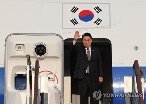 | ▲ President Yoon Suk Yeol waves before leaving for the United States on Aug. 17, 2023, for a trilateral summit meeting with U.S. President Joe Biden and Japanese Prime Minister Fumio Kishida at the Camp David presidential retreat. (Yonhap) |