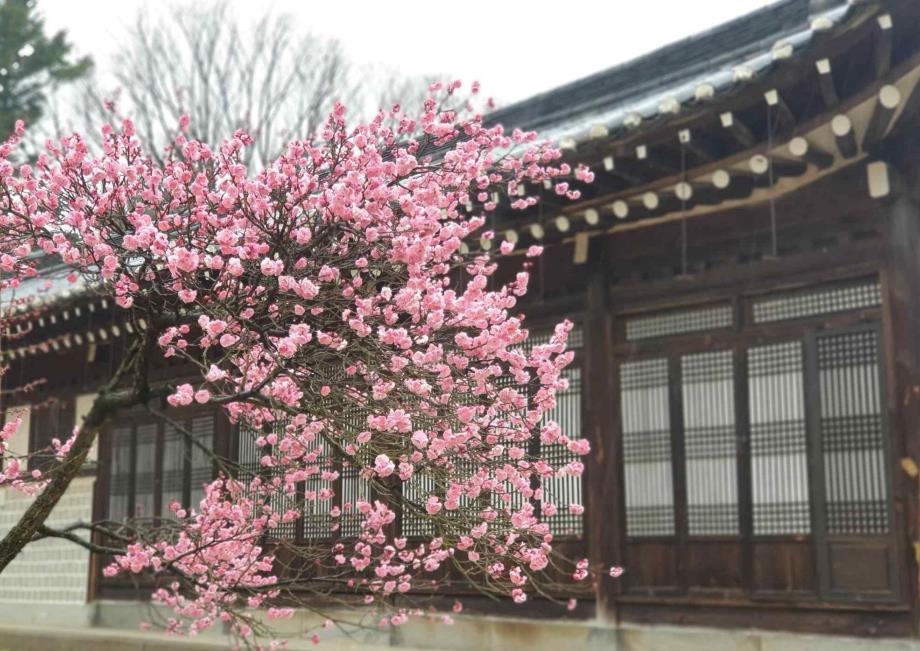 | ▲ 현충사 충무공 고택 앞에 핀 홍매화 모습 [문화재청 제공. 재판매 및 DB 금지] |