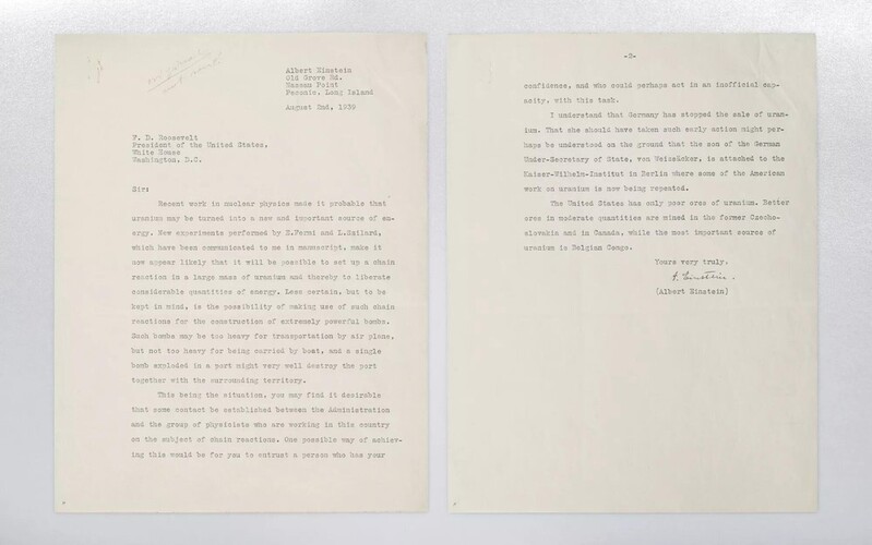 이 편지는 아인슈타인이 1939년 여름 당시 루스벨트 대통령에게 나치의 핵무기 개발 위험성에 대해 경고해달라는 미국 과학자들의 요청을 받고 쓴 것이다.