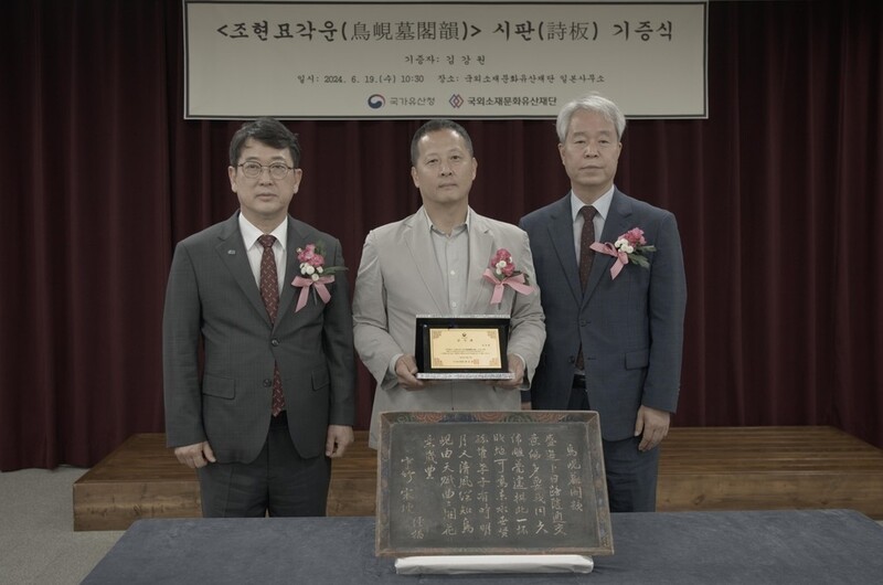 | ▲ '조현묘각운' 시판 기증 왼쪽부터 최응천 국가유산청장, 김강원 청고당 대표, 곽창용 국외소재문화유산재단 사무총장 [국가유산청 제공. 재판매 및 DB 금지] |