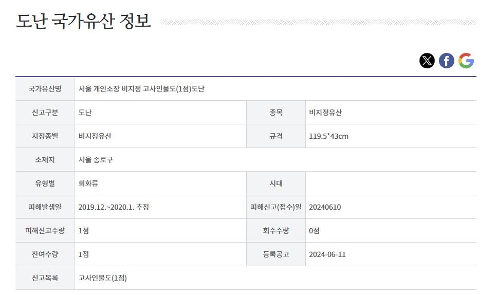 이들은 관할 지방자치단체와 국가유산청에 신고를 하면서 "족자 형태의 그림을 말아서 오동나무 상자에 보관해왔으나, 2020년 1월 사무실을 정리하는 과정에서 소장품이 없어진 것을 확인했다"고 설명했다.