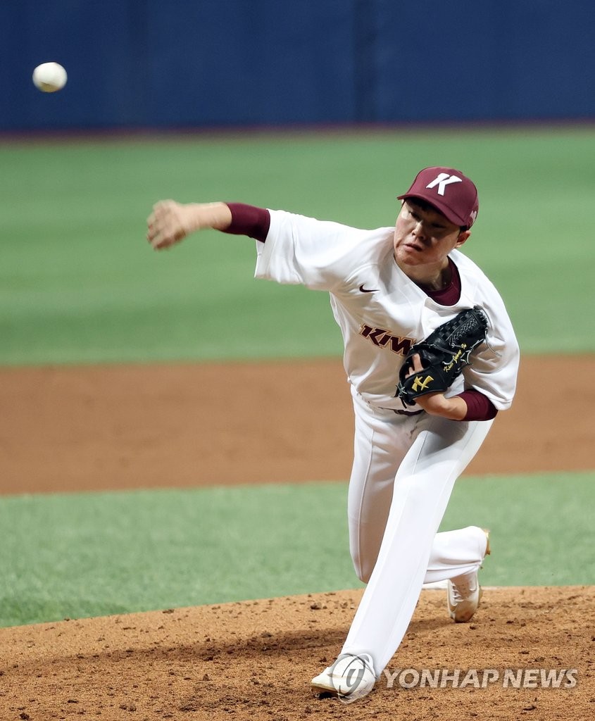 ▲ In this file photo from March 2, 2021, Kim Jeong-in of the Kiwoom Heroes pitches in an intrasquad game at Gocheok Sky Dome in Seoul. (Yonhap)
