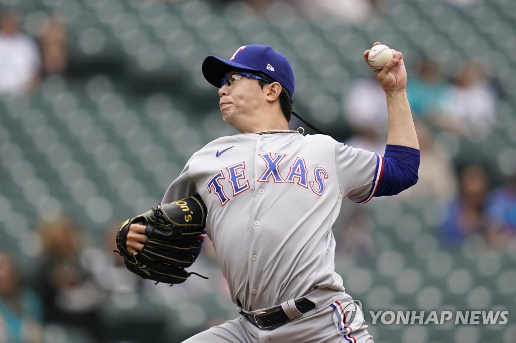 | ▲ In this Associated Press photo, Yang Hyeon-jong of the Texas Rangers pitches against the Seattle Mariners during the bottom of the first inning of a Major League Baseball regular season game at T-Mobile Park in Seattle on May 30, 2021. (Yonhap) |
