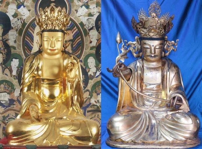 | ▲ 왼쪽부터 '김해 은하사 대웅전 목조관음보살좌상', '김해 대광명사 목조보살좌상' [경남도 제공. 재판매 및 DB 금지] |