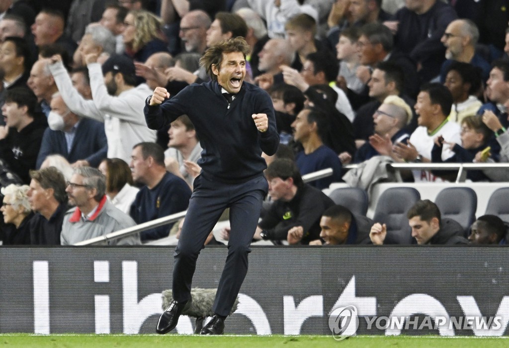 ▲ 손흥민이 터뜨린 팀의 5번째 골에 기뻐하는 토트넘의 콘테 감독 [로이터=연합뉴스]