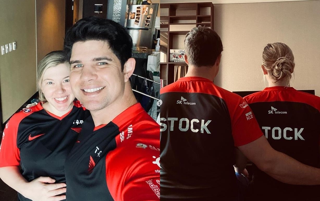 | ▲ e스포츠팀 T1 유니폼을 입고 즐거워하는 두산 스탁(왼쪽)과 아내 [로버스 스탁 인스타그램 캡처. 재판매 및 DB 금지] |