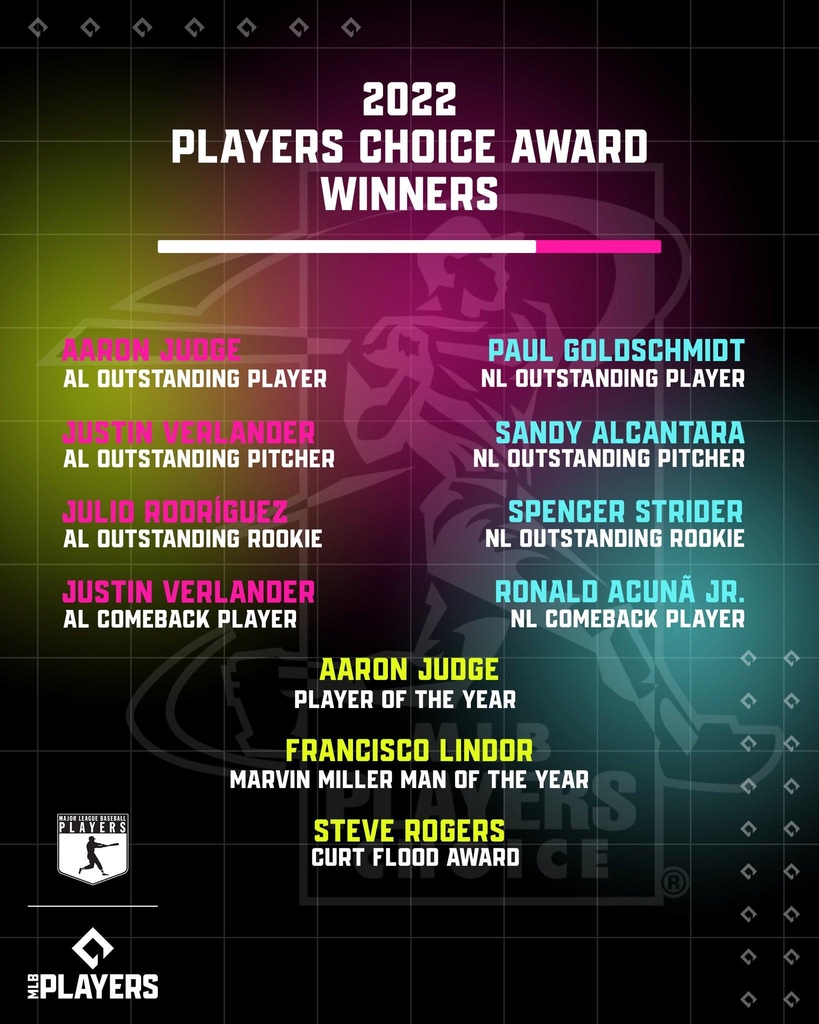 MLB 선수노조는 5일(한국시간) 2022 플레이어스 초이스 어워즈(Players Choice Awards) 수상자 명단을 공개했다.