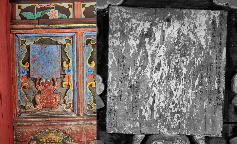 | ▲ 경산 환성사 대웅전 불단 묵서(왼쪽)와 적외선 촬영 사진 [국가유산청 제공. 재판매 및 DB 금지] |