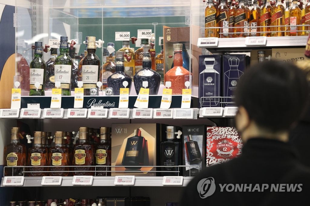▲ A shopper looks at a selection of whiskey at a large discount supermarket in Seoul on Jan. 12, 2022. (Yonhap)