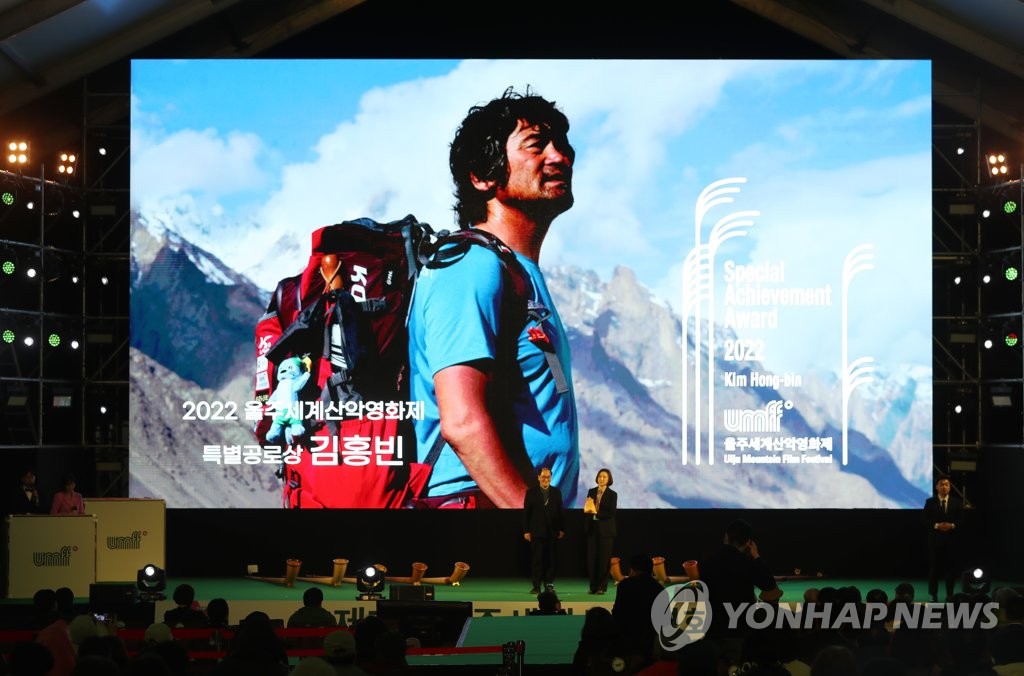 | ▲ 울주세계산악문화상 특별공로상에 고 김홍빈 대장 지난 1일 오후 울산시 울주군 영남알프스 복합웰컴센터에서 열린 제7회 울주세계산악영화제 개막식에서 산악인 고(故) 김홍빈 대장이 울주세계산악문화상 특별공로상 수상자로 선정돼 김 대장의 아내 방영은 씨가 상을 받고 있다. [연합뉴스 자료사진] |