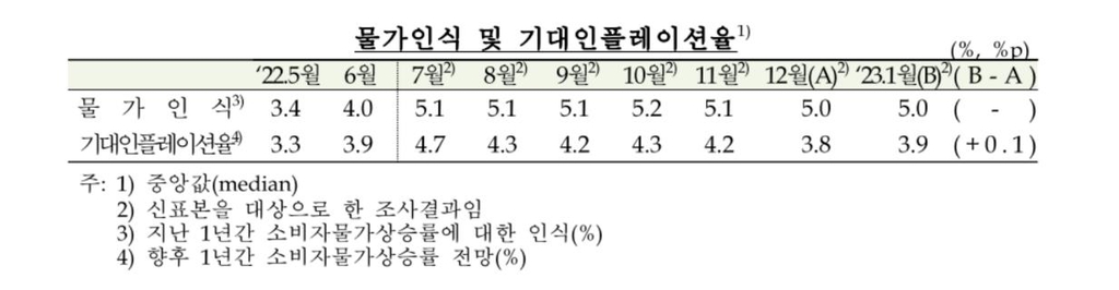 향후 1년간의 소비자물가 상승률 전망치인 기대인플레이션율은 지난해 7월 4.7%로 역대 최고치를 찍은 이후 4%대에서 오르내리기를 반복하다가, 지난 12월 처음 3%대로 떨어졌으나 이달 들어 소폭 상승했다.