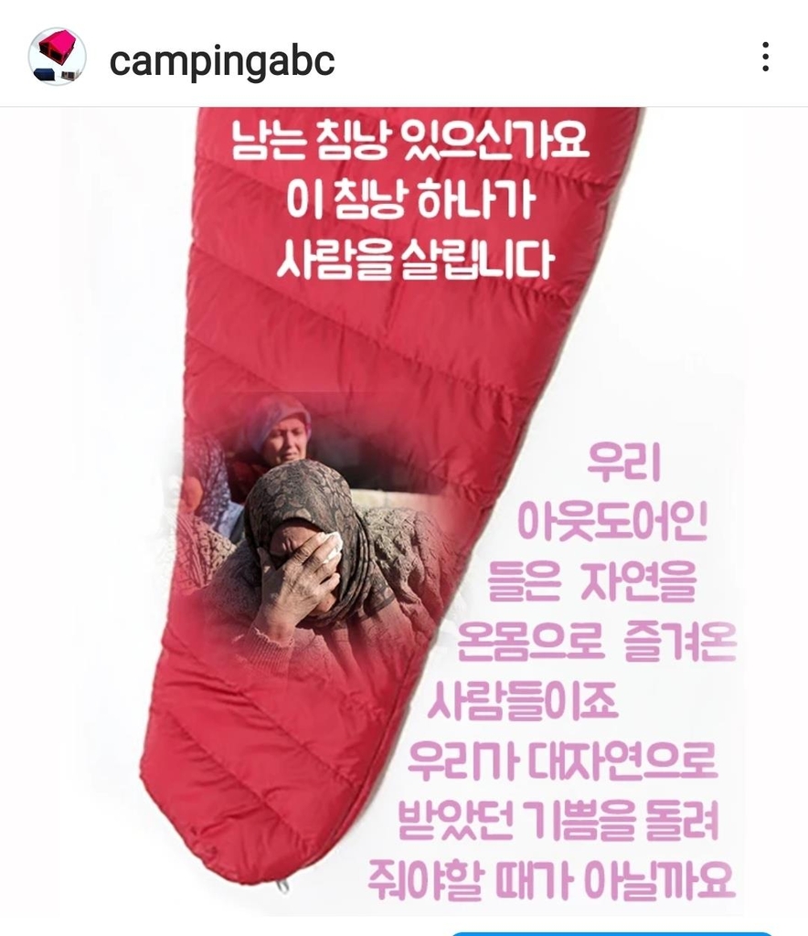 아웃도어업체 캠핑ABC는 최근 인스타그램에 쓰지 않거나 쓰임새가 적은 침낭을 모아서 보내달라고 호소하는 글을 올렸다.