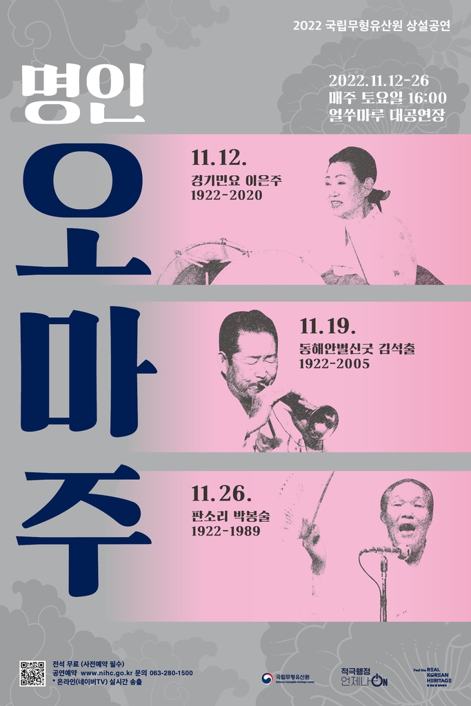 국립무형유산원은 이달 12일, 19일, 26일 토요일 세 차례에 걸쳐 전북 전주시 국립무형유산원 얼쑤마루 대공연장에서 '2022 명인 오마주' 공연을 연다고 10일 밝혔다.