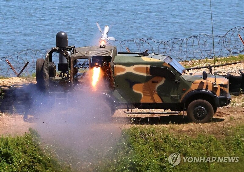 | ▲ Marines on the northwestern border island of Yeonpyeong fire a Spike anti-tank missile into waters off the island on June 26, 2024. (Yonhap) |