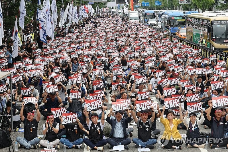 | ▲ Unionized rail workers stage a rally in Seoul's Yongsan district on Sept. 16, 2023. (Yonhap) |