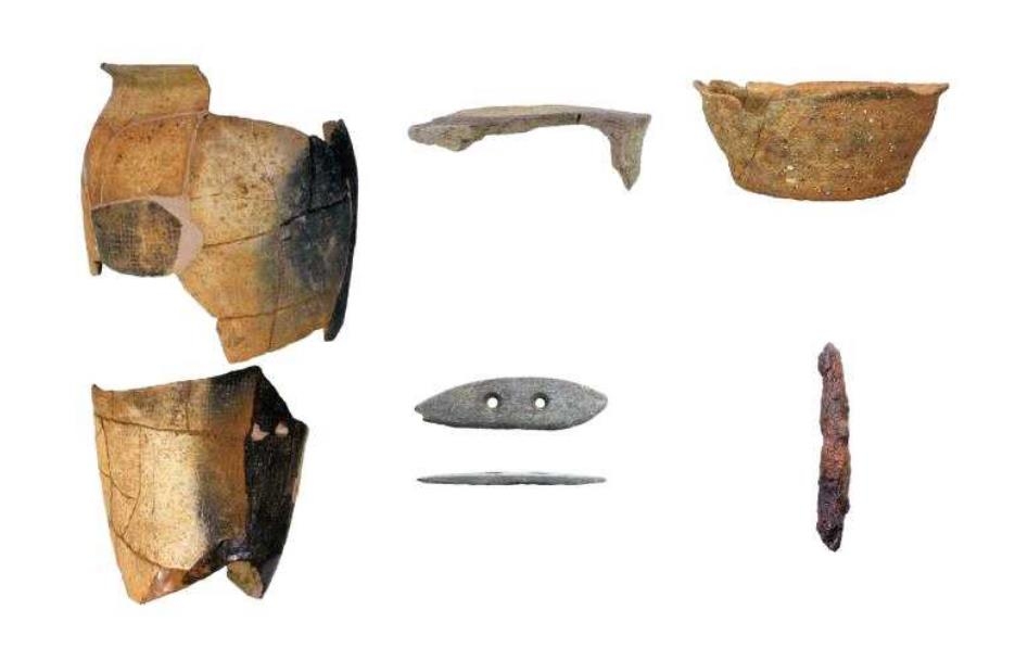 | ▲ '담양 응용리와 태목리 유적'에서 출토된 유물 왼쪽 상·하단은 장란형 토기, 가운뎃줄 상단은 개(덮개), 하단은 석도(돌칼), 오른쪽 상단은 완(사발), 하단은 용도가 불명확한 철기. [문화재청 제공. 재판매 및 DB 금지] |
