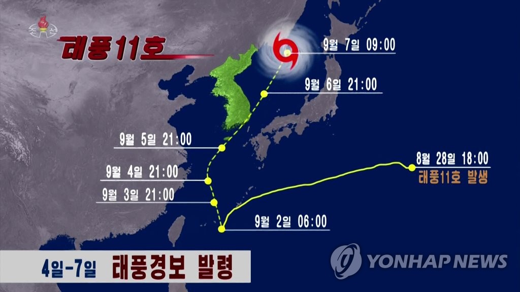 SEOUL, Sept. 5 (Yonhap) -- North Korea is taking precautionary measures as it braces for a "super strong" typhoon churning toward the Korean Peninsula, according to its state media Monday.