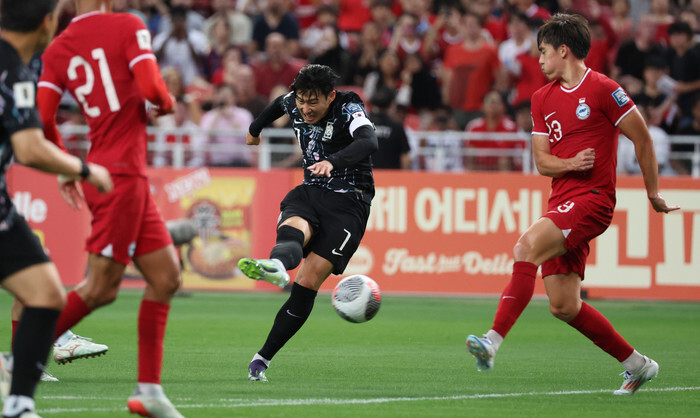 Son Heung-min of South Korea scores a goal against Singapore during their Group C match in the second round of the Asian World Cup qualification at the National Stadium in Singapore on June 6, 2024. (Yonhap)