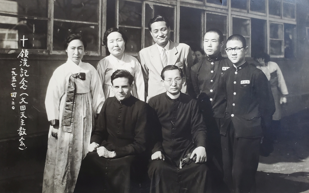 | ▲ 대전 사목 시절의 두봉 (의성=연합뉴스) 이세원 기자 = 두봉 주교가 대전 교구에서 사목하는 시절에 찍은 사진. '영세기념(대전천주교회) 1957.4.20'이라고 한자로 적혀 있다. [두봉 주교 보유 사진 재촬영] |