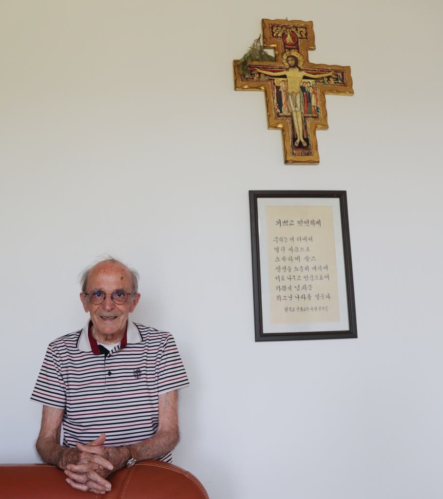 ▲ 6·25가 났을 때 나는 저쪽(유럽)에서 군 생활을 하고 있었다. 모든 청년이 1년 동안 군 생활을 하게 돼 있었다. 프랑스 정부에서 (한국에) 파병을 결정했고 가고 싶으면 지원하라고 했다. 나는 신학교를 다니고 있었고 신부가 되기 전이라서 지원을 안 했다. 그런데 군에서 만난 친구가 지원했고 한국에서 전사했다. 그것이 한국과의 첫 인연이다. 나는 파리 외방 전교회에 들어갔는데 그때는 한국으로 발령을 받을 것 같지는 않았다. 내가 (사제)품을 받은 것이 1953년도였는데 아직 전쟁이 계속 중이었기 때문이다. 그런데 뜻밖에 한국으로 발령받았다. 어른들은 곧 휴전하리라는 것을 알고 있었다. (한국 발령 소식에) 얼마나 좋아했는지 모른다.
