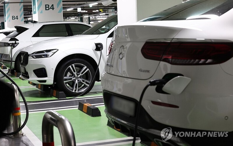 ▲ This file photo from May 6, 2024, shows plug-in hybrid vehicles being charged at a parking lot in Seoul. (Yonhap)