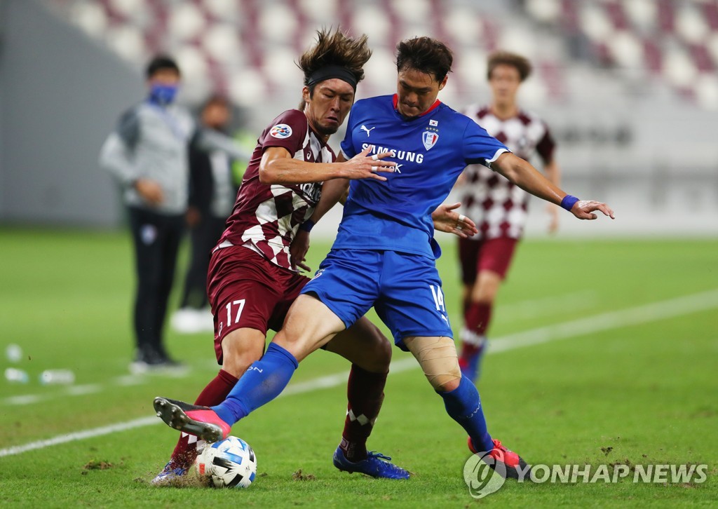 | ▲ In this Reuters photo, Kim Gun-hee of Suwon Samsung Bluewings (R) battles Ryuho Kikuchi of Vissel Kobe for the ball during their Group G match at the Asian Football Confederation Champions League at Khalifa International Stadium in Doha on Dec. 4, 2020. (Yonhap) |