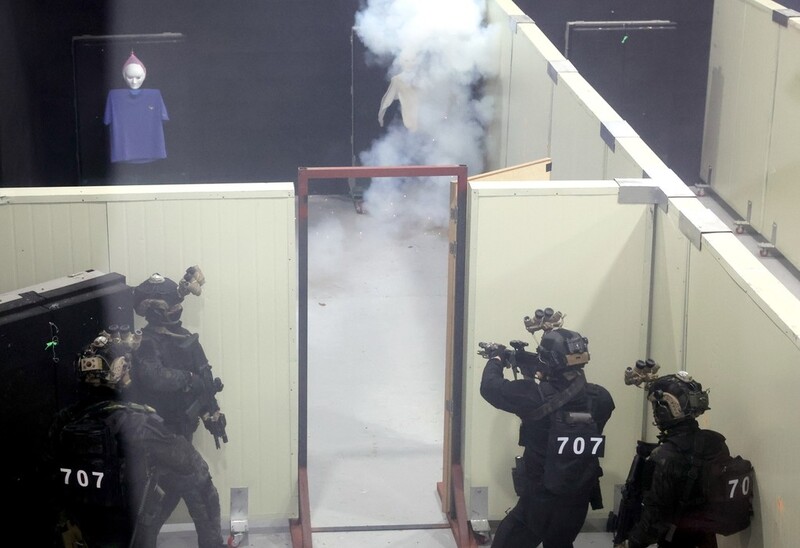 At the Gwangju training range, the unit held aircraft hostage rescue drills, utilizing a real-size mock passenger plane, during which troops entered the aircraft to overpower a group of terrorists.