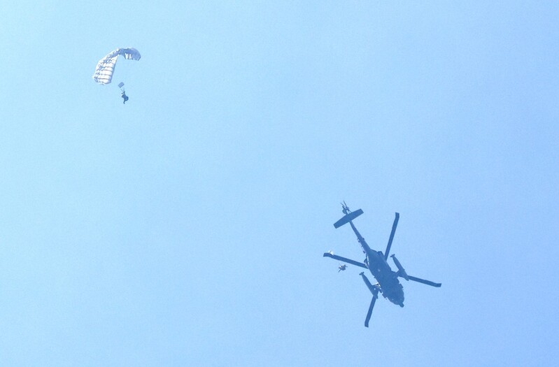 In another demonstration, six commandos jumped out of a UH-60 Black Hawk helicopter at around 5,000 feet (1,524 meters) above the training ground, softly parachuting onto a target area to demonstrate their airborne infiltration capabilities.