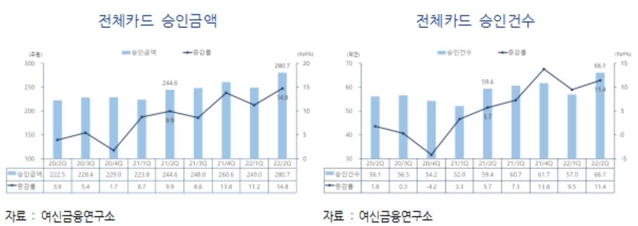 29일 여신금융협회가 공개한 '2022년 2분기 카드승인실적 분석' 자료에 따르면 올해 4∼6월 전체 카드 승인금액은 280조7천억원으로 지난해 같은 기간 대비 14.8% 증가했다.