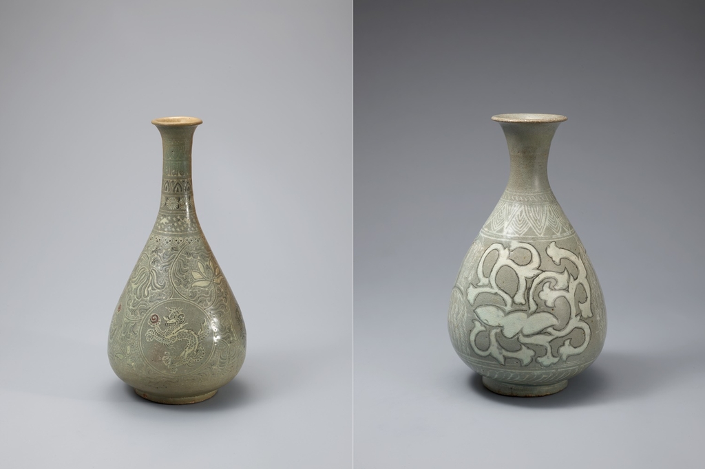 | ▲ 호림박물관 특별전 전시유물 왼쪽부터 각각 보물로 지정된 청자 상감동채 연당초용문 병, 분청사기 상감 연화모란류문 병. [호림박물관 제공. 재판매 및 DB 금지] |