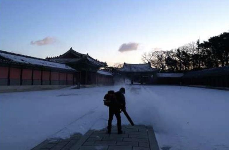 관람객 안전 관리를 담당하는 조범래 씨가 찍은 '관리반 선생님들 항상 수고가 많으십니다'라는 제목의 사진은 눈이 많이 내린 어느 날 새벽부터 땀방울을 흘린 동료의 모습을 포착했다.