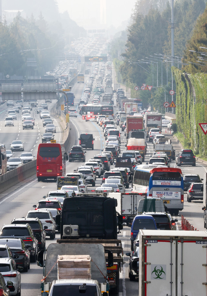 Bumper-to-bumper traffic clogs one side of a highway to the port city of Busan in Seoul's Seocho Ward on Oct. 2, 2025, as the annual rush began of travelers heading to their hometowns and resort areas for the Chuseok holiday, the Korean autumn harvest celebration, which falls on Oct. 6 this year. Transportation authorities say more than 32.18 million people are expected to commute from Oct. 2-11. (Yonhap)