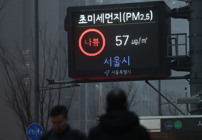 An electric signboard near City Hall in Seoul shows that the atmospheric level of PM2.5, harmful particles smaller than 2.5 microns in diameter, is "bad," with 57 micrograms per cubic meter, on Jan. 16, 2026. (Yonhap)