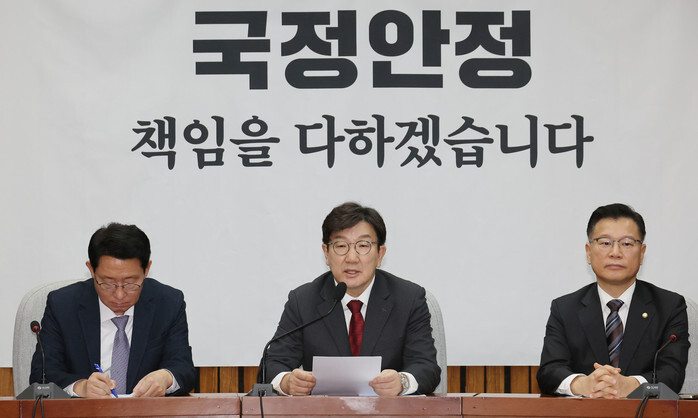 Kweon Seong-dong (C), floor leader of the ruling People Power Party, speaks during a meeting of the party at the National Assembly in Seoul on Jan. 17, 2025. (Yonhap)
