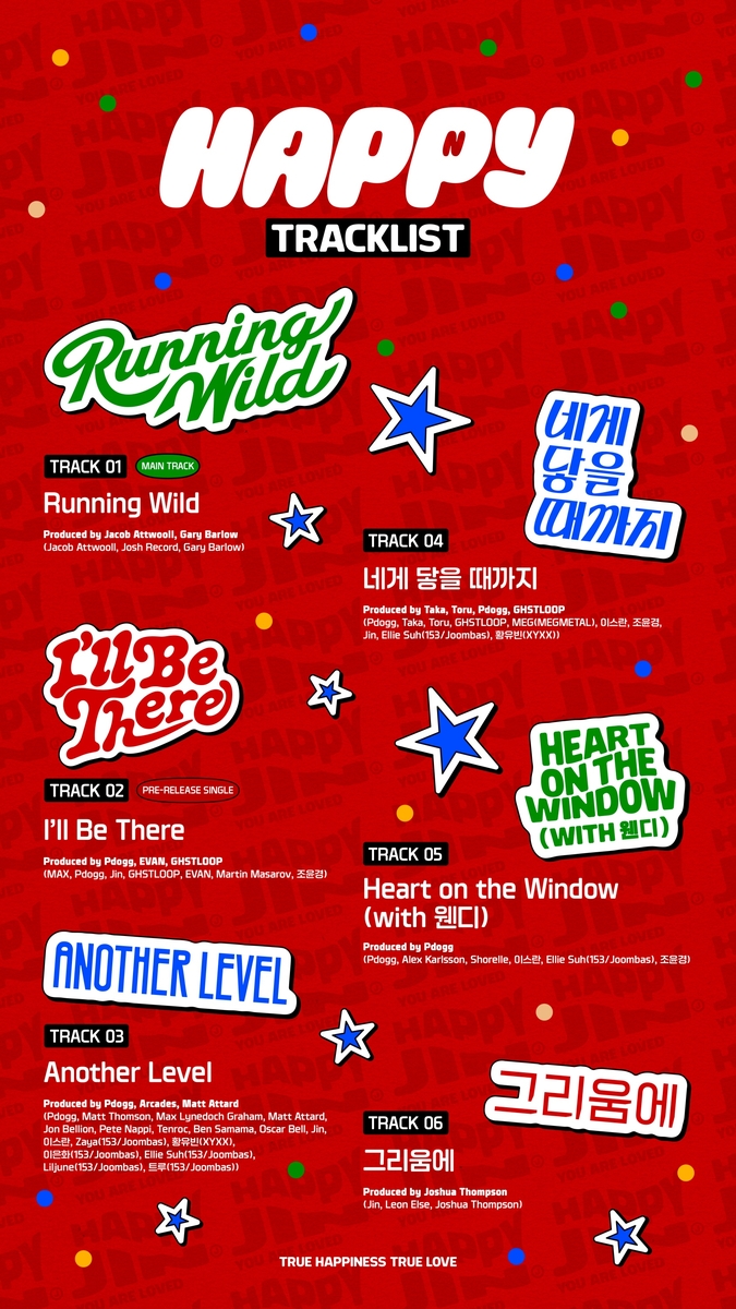 진은 이날 공식 사회관계망서비스(SNS)를 통해 이 같은 내용이 포함된 솔로 앨범 '해피'(Happy)의 트랙리스트를 공개했다.