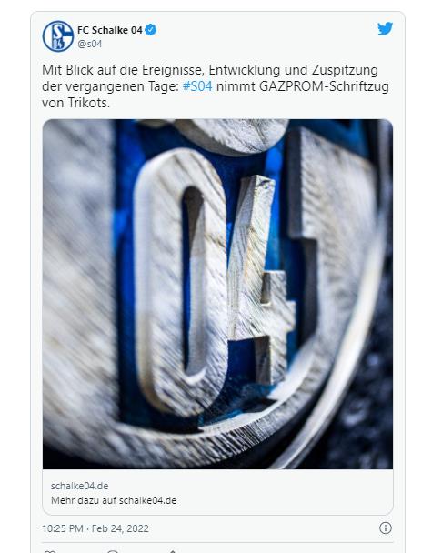 샬케는 24일(현지시간) 구단 홈페이지에 "우리는 최근 상황을 고려해 메인 스폰서인 가즈프롬의 로고를 유니폼 셔츠에서 제거하기로 했다"고 밝혔다.