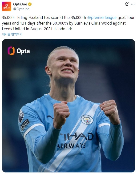 | ▲ EPL 통산 3만5천호골 주인공이 된 엘링 홀란 [옵타 SNS 캡처. 재판매 및 DB 금지] |