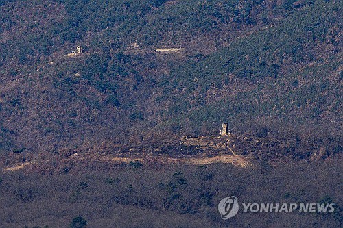 ▲ This file photo, taken Nov. 28, 2023 from South Korea's Gyeonggi Province, shows a North Korean guard post within the Demilitarized Zone separating the two Koreas. (Yonhap)