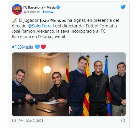 | ▲ 호나우지뉴의 아들 주앙 멘지스의 유스팀 입단 소식을 전한 FC바르셀로나. [FC바르셀로나 유스팀 트위터. 재판매 및 DB 금지] |