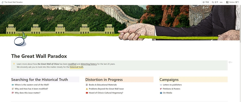| ▲ '만리장성의 역설' 제목의 영문 사이트 [홈페이지 캡처] |