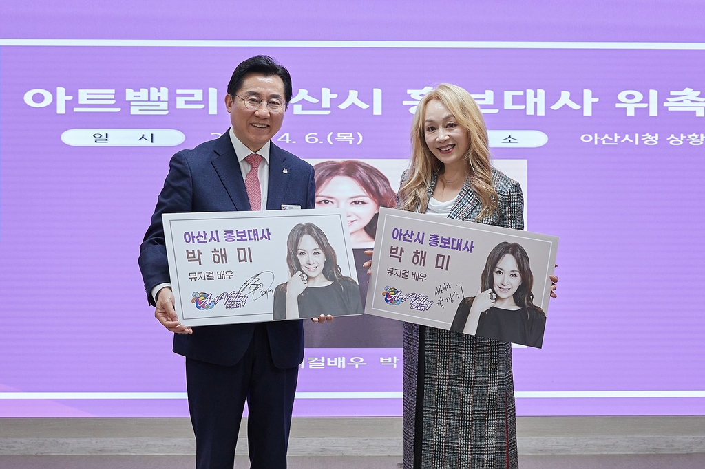 박 시장은 위촉식에서 "'아트밸리 아산'이라는 도시브랜드와 함께 문화예술 도시로 새롭게 도약하고 있는 아산시와, 뮤지컬계 대모이신 박해미 배우님의 동행에 기대가 크다"고 말했다.