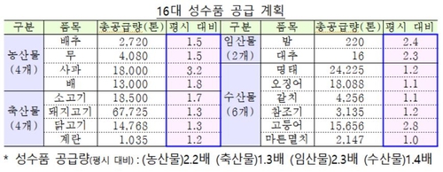 성수품 공급량은 농산물이 평시 대비 2.2배, 축산물 1.3배, 임산물 2.3배, 수산물은 1.4배다.