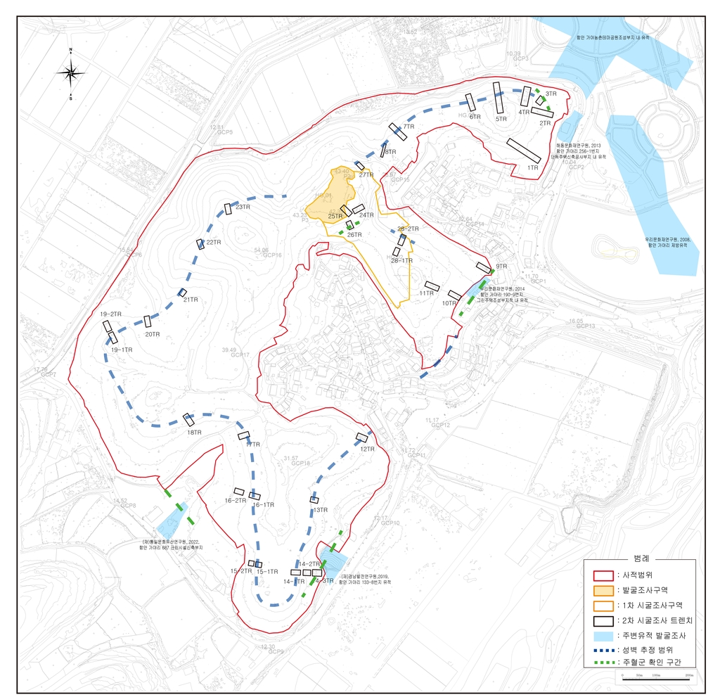 가야문화재연구소는 조사 지역에서 대부분 나무기둥 구멍과 흙을 다져 올린 성토층 등 토성 흔적을 찾아냈고, 토성 잔존 추정 지점들을 선으로 연결해 토성 길이가 최소 2㎞라는 사실을 파악했다.