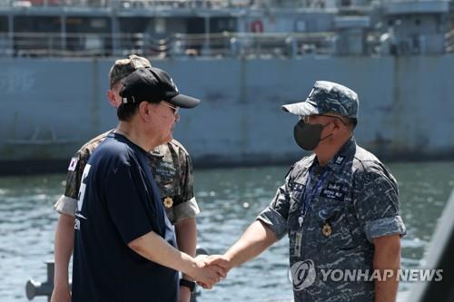 | ▲ President Yoon Suk Yeol (L) shakes hands with a naval officer during a visit to a naval base in Jinhae, 311 kilometers southeast of Seoul, on Aug. 3, 2023, taking time out of his weeklong summer vacation, in this photo provided by the presidential office. (PHOTO NOT FOR SALE) (Yonhap) |
